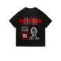 Featuring glitch art, layered text, and a striking line-art face, it fuses digital noise with streetwear edge.