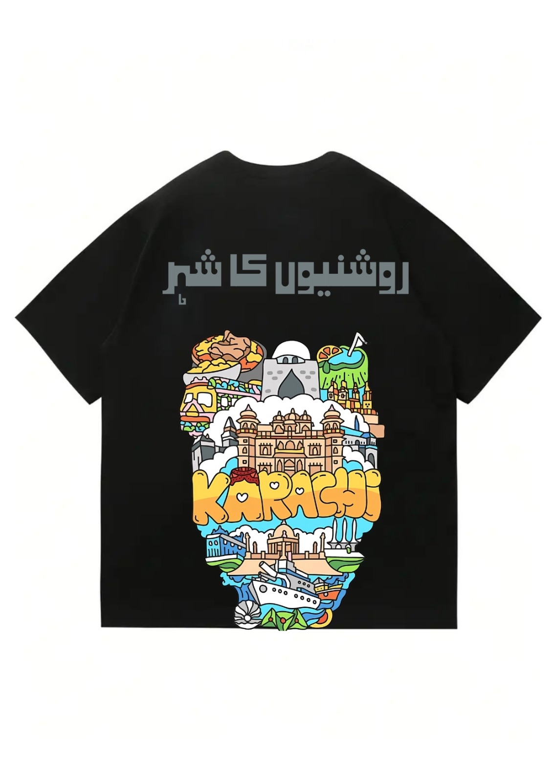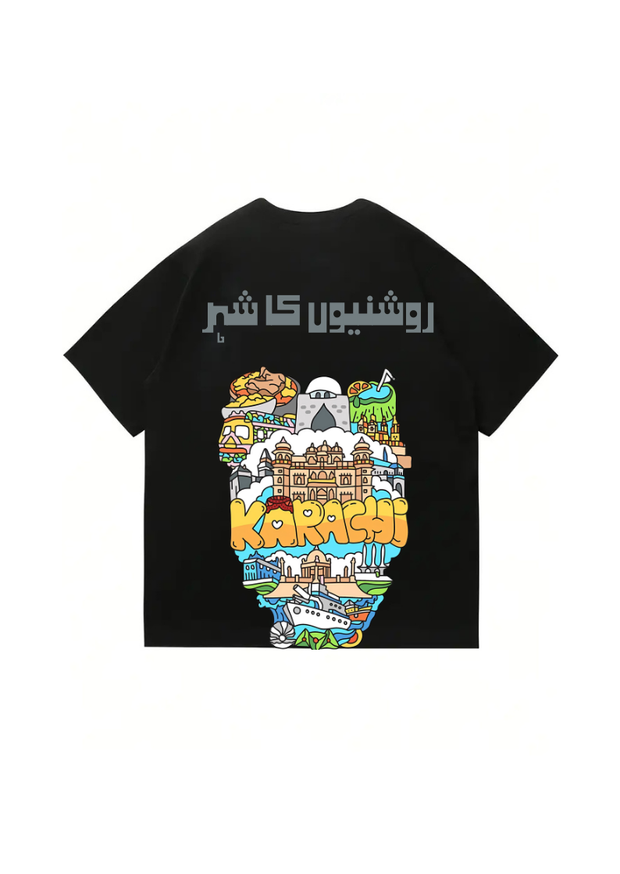 Celebrate the vibrant soul of Karachi with City of Lights — a bold graphic tee featuring iconic landmarks, street food, and coastal vibes. The colorful illustration captures the city’s heritage and hustle in one dynamic design.